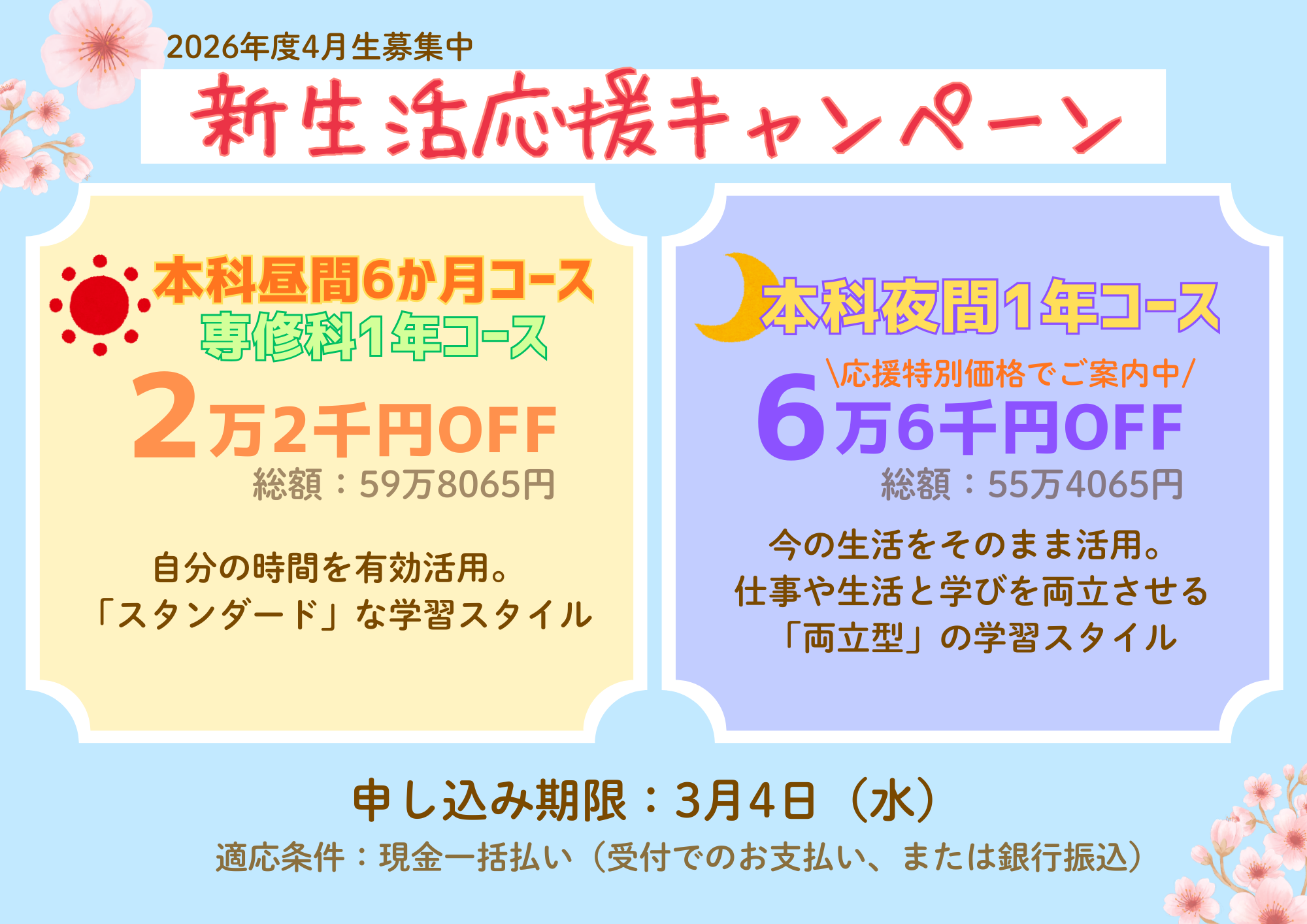 最初のお支払いの時に、入学金+半期分授業料+教科書代+施設維持費をお支払いいただきます。2回目のお支払い時に、残り半期分の授業料をお支払いください。 (例 本科昼間6か月コース、本科夜間1年コース、専修科1年コースの場合:初回入金 362,065円、2回目 258,000円) |